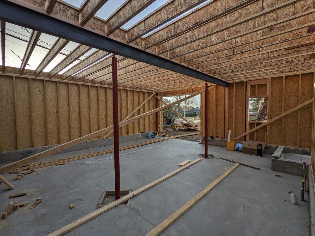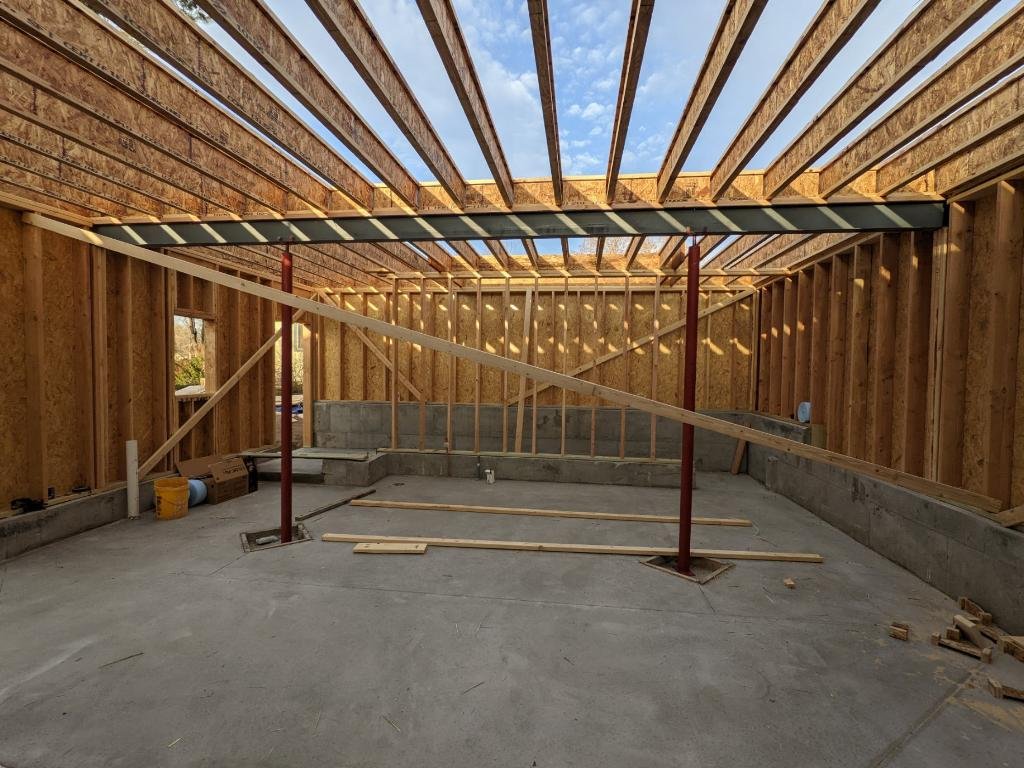 Exterior porch w eleven 40-foot-deep helical piers, steel beams, and engineered trusses.