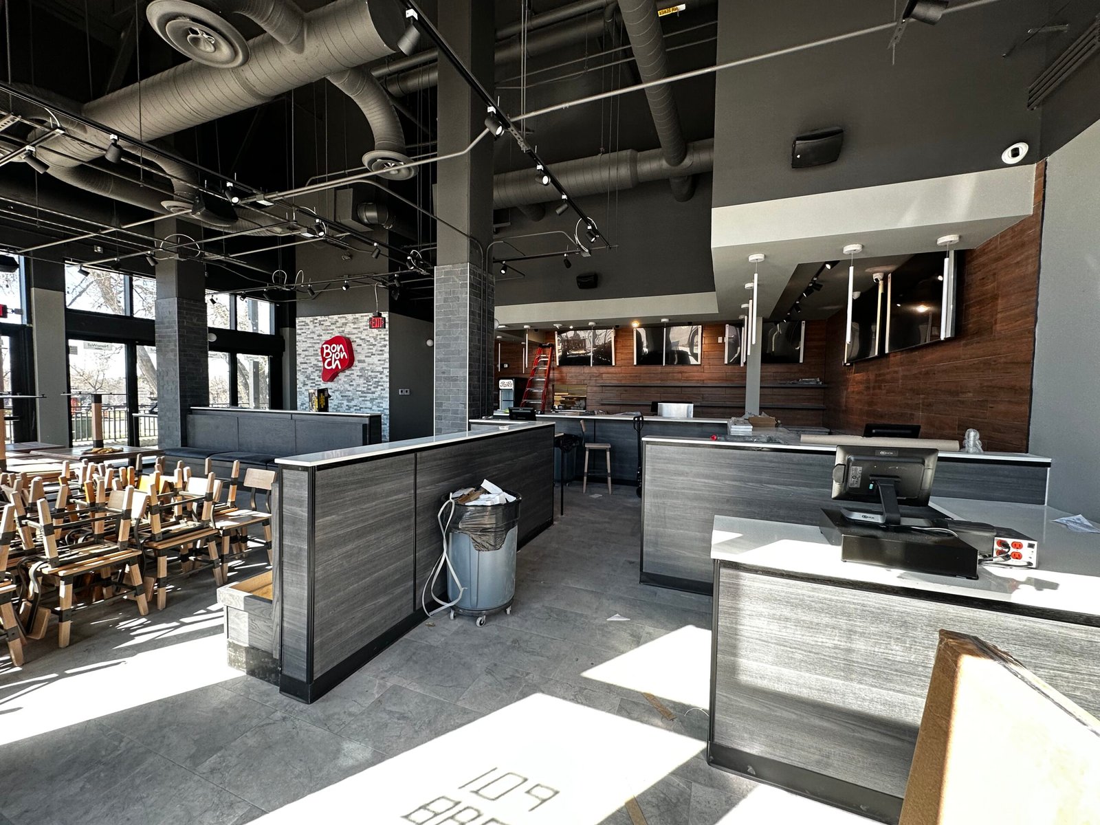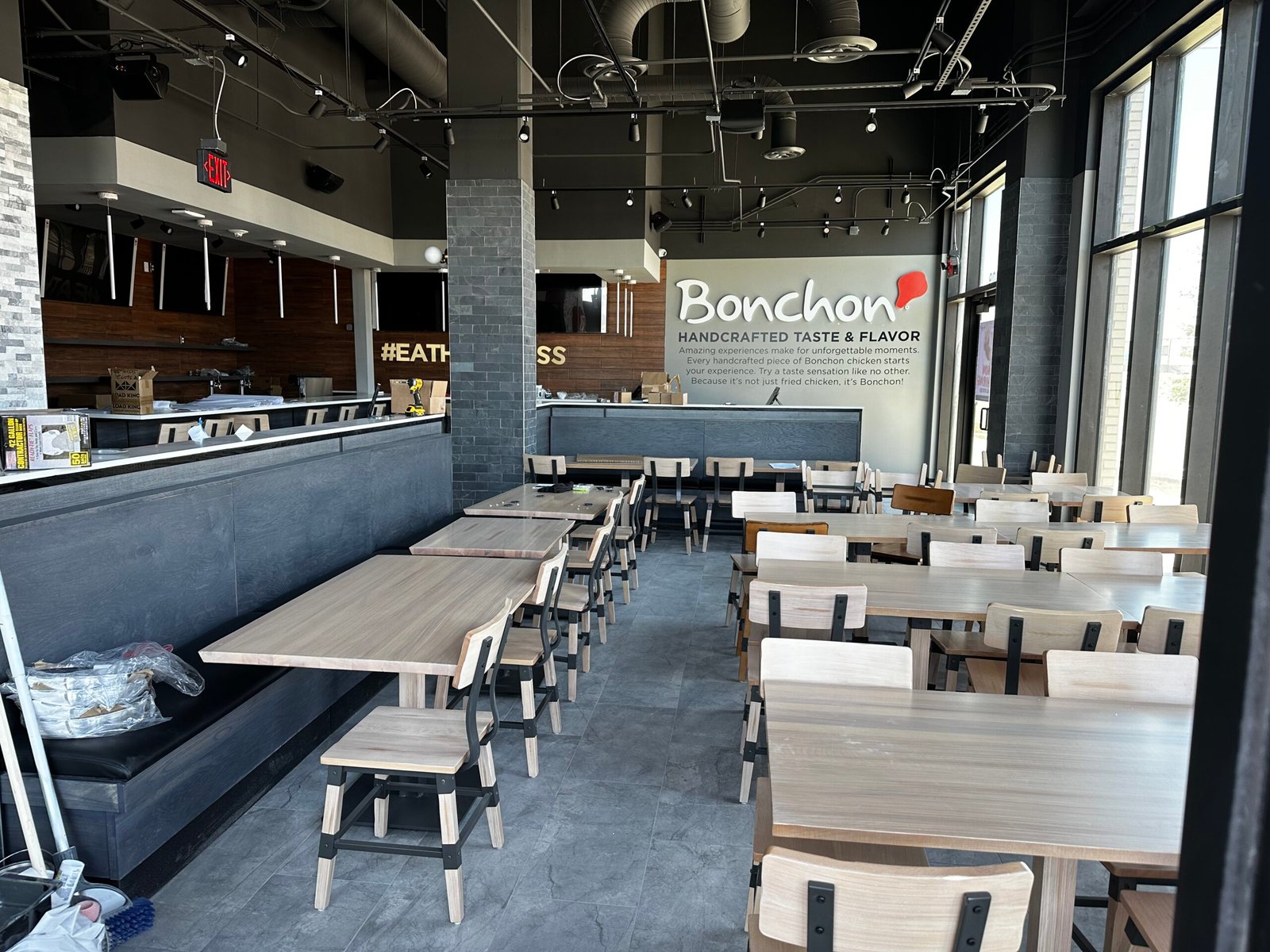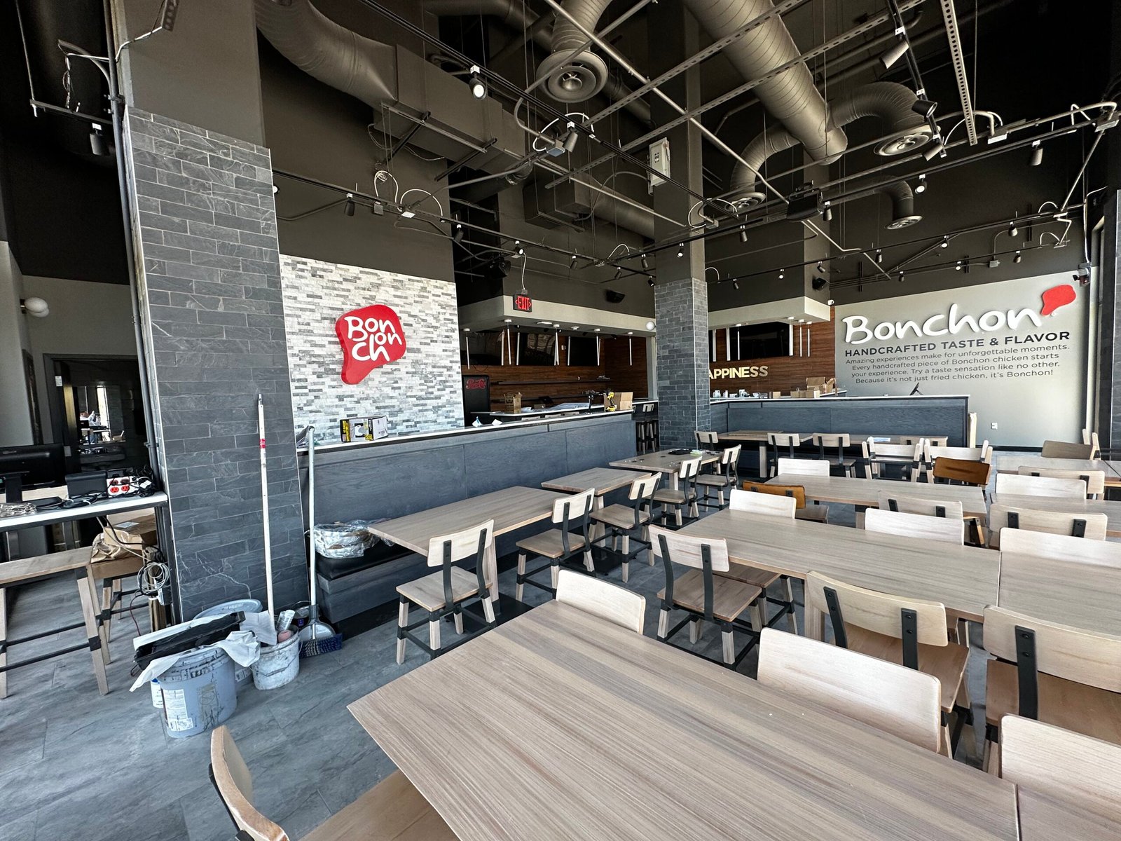 Tenant finish of Korean Fried Chicken at mixed residential/commercial building. Restaurant with new hood, kitchen, and lobby.